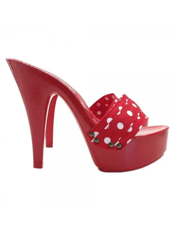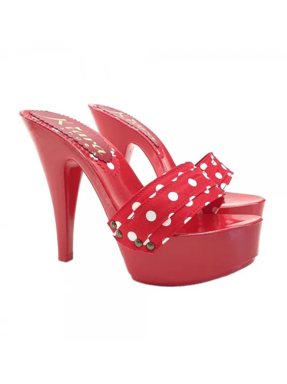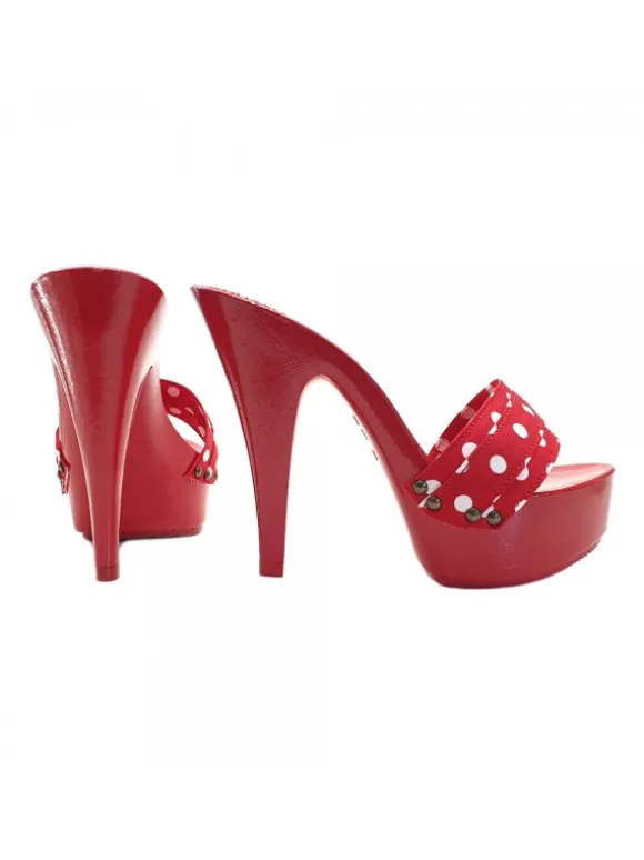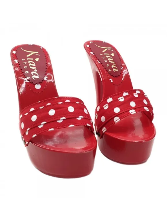 Zoccoli base BROWN effetto legno, doppia fascia colore ROSSA A POIS con tacco 13 CM + plateau 4 cm. Stabile e comodo realizzato interamente in ITALIA. Lavorazione artigianale.