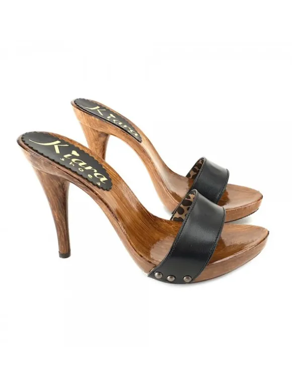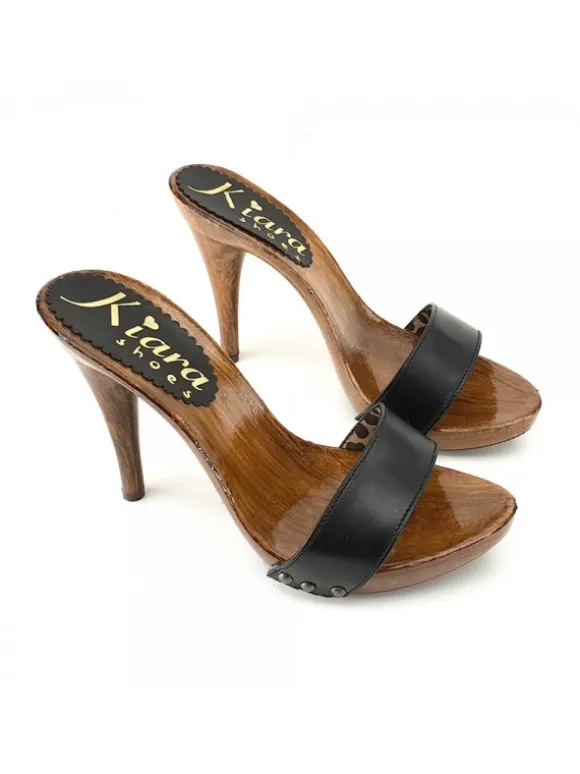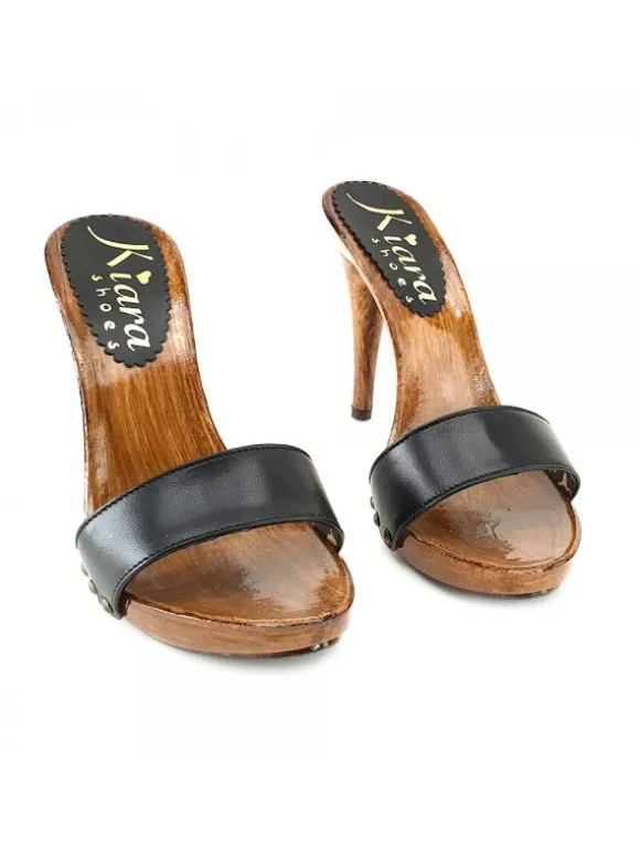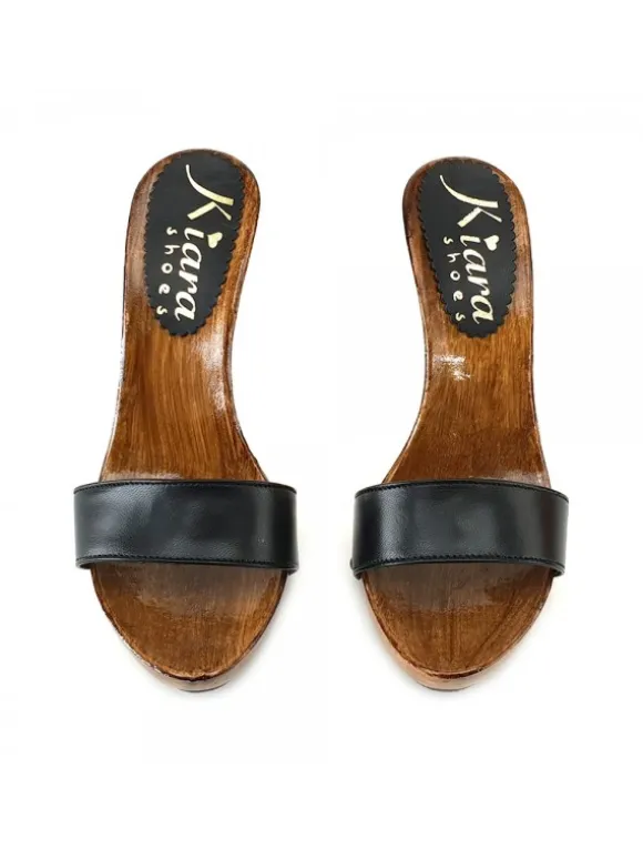 Zoccolo da donna con tacco 12 cm. Tomaia in pelle Nera. Stabile e comodo, realizzato interamente in ITALIA. Lavorazione artigianale.